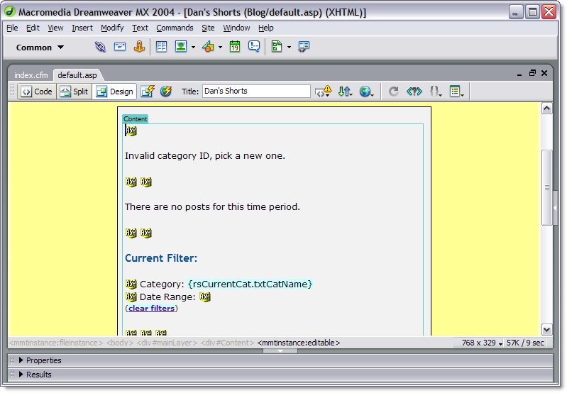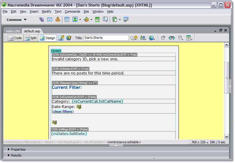 If you like If statements in ASP VBScript as much as I do (and really, who doesn't?), then you need DWfaq's Custom Conditional Region. It tacks a comment on the end of your If and End If statements allowing them to be rendered in Dreamweaver's Design view. The comments also help you peg down what End Ifs go with which Ifs. I used CCR to write all of the conditional logic for the front page of the blog, and figured I'd show you how well it works.